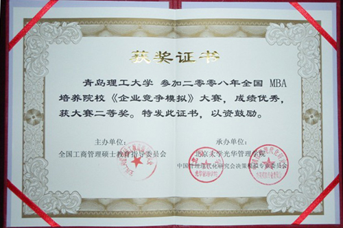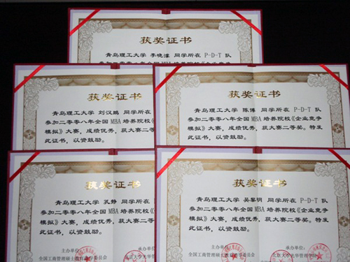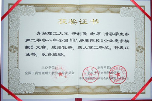 在近日结束的第七届全国MBA培养院校企业竞争模拟大赛中,由我校管理学院李晓濛、陈博、刘汉鹏、孔静、吴黎明组成的代表队喜获全国二等奖,指导老师是于利俊,我校是所有获奖院校中两个非211工程院校之一,也是山东省唯一一所获奖院校。
