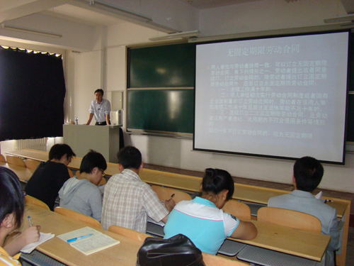 宋立山副院长通过对新颁布实施的《劳动合同法》法条的解析、劳动争议案例的分析等方式对毕业生在就业过程中容易出现的问题进行了分析和说明,为毕业生顺利完成就业过渡提供了明确的法律指导。毕业在即,学校也提醒广大毕业生对自身的就业要有一个明确的定位,同时要认真学习相关法律常识,建立必需的法律法规知识储备。(招就办)