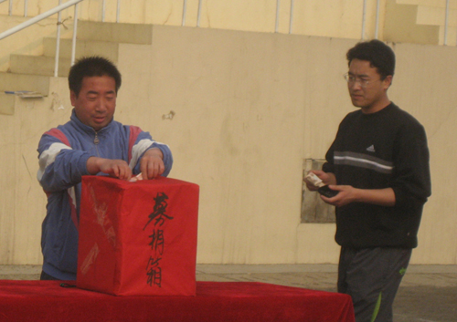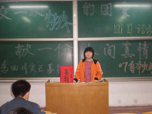 本次活动由“交一次特殊团费,献一份人间真情”团员捐款、校园个人自愿捐款、校教工足球协会与“校长杯”组委会足球赈灾义赛及赈灾义演晚会四个部分组成。活动倡议:“真情传递,爱心永恒”。大灾面前,需要的是信心,需要的是勇气,需要的是我们每一个人伸出温暖援助之手,为灾区人民撑起一片天空,为灾区人民点燃生命的火焰!在捐款现场,我校广大师生纷纷伸出援助之手,为灾区捐款,从几元到几百元,凝结了同学们对灾区人民真诚的关爱与帮助。