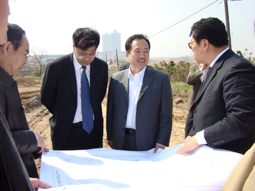 在现场,仪校长听取了教育小区和新校区建设进展情况的汇报。对教育小区树木移栽、主干道改道、新校区风热管线迁移等问题进行现场办公。