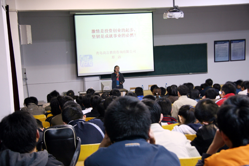 邢洁总经理以其满怀的创业激情、先进的创业理念、突出的创业事迹,被评为青岛市优秀创业青年,入围中央电视台“赢在中国”节目评比的全国108位优秀创业者,并在全国率先推出了“全人培养”创业项目,曾被中央电视台、齐鲁晚报、半岛都市报、青岛电视台等多家媒体采访报道。此次讲座她以“激情是投资创业的起步,坚韧是成就事业的必然”为题,从什么是“激情”、“投资”、“坚韧”的提问入手,结合自身创业经历全面介绍了“全人培养”创业项目,系统分析了创业者应该具备的基本品质,为大学生创业提出中肯的建议并推荐经典的创业书目,强调要先学做人,再做创业人;要理性对待创业,厚积而薄发;要三思后行,该出手时出手等等,与同学们深入交流了她在创业历程中的感受体悟和心得经验。接下来,邢总与学生们进行了气氛热烈的现场互动,耐心解答了同学们就创业基础、创业团队、组织管理、人际关系等诸多方面提出的问题。
