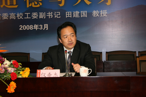田建国副书记代表省委高校工委对我校“新世纪讲坛”开讲表示祝贺。他说,“新世纪讲坛”的开讲是学校提高教育质量、促进内涵发展的一件大事。重要意义有二。一是满足了国家社会发展的需要,二是顺应了世界高等教育发展的趋势。田建国教授在讲话中为大家精辟诠释了“创新、道德、人才”三个概念,从二十一世纪的时代特征、人才成长的挑战、思想道德与成长成才关系等方面,全面分析了当代大学生面临的国际、国内背景,指出经济全球化、科学技术全球化、市场经济的发展和信息多元化等已成为现代大学生成才发展所面临的主要挑战。针对当代大学生特点,田建国教授提出了要做到十个学会,清晰阐述了创新人才的基本内涵及成为创新人才的需着力把握的几个方面,就如何正确理解、认识人才,成才的意义,如何成才等问题进行了详细的分析。