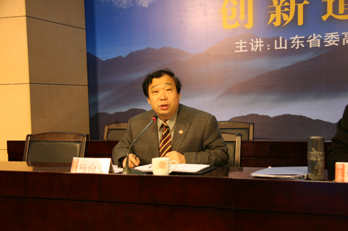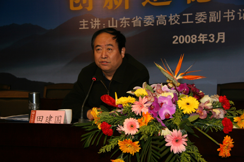 3月25日下午,由人文与社会科学学院、党委宣传部、学生处、团委共同举办的校园文化建设品牌工程——“新世纪讲坛”举行开讲仪式。省委高校工委副书记、国家教育发展专家咨询委员、中国高等教育管理研究会副会长、中国海洋大学博士生导师、山东大学博士生导师、我校特聘教授田建国到场祝贺并讲话。校长仪垂杰在仪式上讲话,党委副书记杨向荣主持仪式,副校长李东出席。600多名学生代表、学生工作干部及部分教师参加仪式。