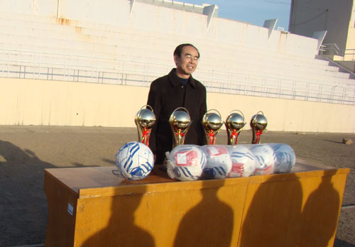 3月6日下午,在黄岛校区田径场,校长助理、黄岛校区足协主席朱申红教授为荣获2007年度金球奖等六项奖获得者颁发奖杯与奖品。王先鹿、张桂清、鞠志强、申维东、黄晓兵、张琦老师赢得此殊荣。