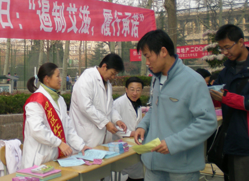 2007年12月1日是第20个“世界艾滋病日”,今年的宣传主题是“遏制艾滋,履行承诺”。为有效遏制艾滋病的快速上升势头,形成统一行动的浩大声势,发动广大群众共同抗击艾滋病,营造全社会共同关爱艾滋病患者、减少歧视的和谐氛围,12月1日上午,校医院联合四方区疾控中心、阜新路街道办事处等单位联合在我校四方校区举办“世界艾滋病日”宣传、咨询活动,通过摆放展板、发放安全套及宣传资料、解答疑问等形式,向大学生普及艾滋病知识,提供相关指导,推广健康生活方式。