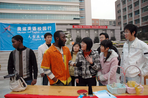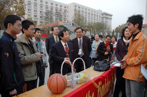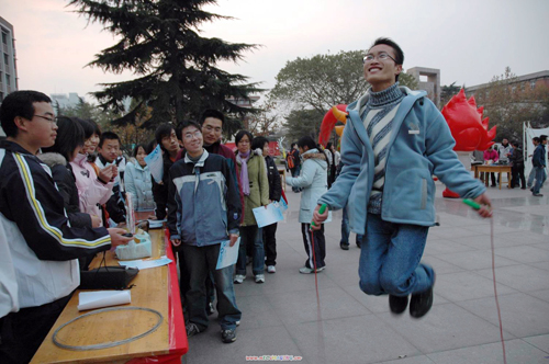 11月19日下午,由外国语学院主办,环境、建筑、机械、土木学院协办的“奥运英语校园行”大型主题英语沙龙活动在科技广场举行。校党委副书记杨向荣来到活动现场并亲自参加了活动。