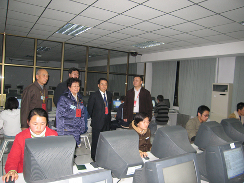 在计算机中心,骆少明教授亲自给同学布置了测试题目,规定在一小时内完成,在机房现场观看了同学们对计算机的操作。骆教授还与计算机中心工作人员进行了座谈,对我校学生的操作能力表示肯定,并对计算机房的硬件建设提出了宝贵的意见和建议。