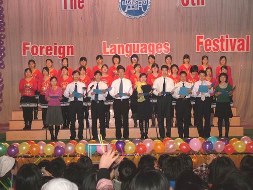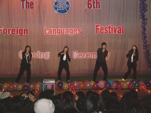 晚会将颁奖和汇报演出穿插进行,融会歌、舞、话剧、武术于一体:开场曼妙轻盈的舞蹈《恰恰》让人大饱眼福,外文歌曲大串烧让观众感受了异域风情,动感十足的街舞用他们激昂的舞步展示了青春魅力;舞蹈《梁祝》缠绵委婉、满含深情,让所有观众动容,掌声迭起;武术双截棍和跆拳道表演的一个又一个高难度动作,令人叹服,不时引其阵阵欢呼;英语短话剧《深山里的呼唤》,以惟妙惟肖的表演,让大家深深理解了深山里的孩子们对读书的强烈渴望,更让大家明白应珍惜学习机会,担负起肩上那份沉甸甸的责任。在师生大合唱《友谊地久天长》优美和谐的歌声中,晚会徐徐帷幕。