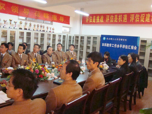 在商学院,院长杨荣本以“夯实基础、拓宽视野,培养应用型工商管理高级专门人才”为题,汇报了学院概况、本科教学的目标与措施、教育教学成就、评建工作和今后努力方向等内容。