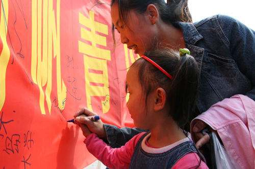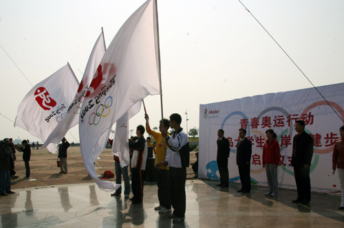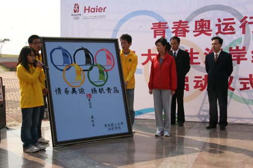我校经贸学院的志愿者们还向奥帆委赠送了同学们一针一线绣制有奥运帆船图案的1.6米x1.9米的作品。宣誓过后,4支大学生志愿者队伍从颜丙峰等老师手中接过2008奥运旗帜,在10时正式向活动目的地启程。