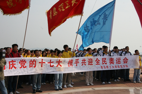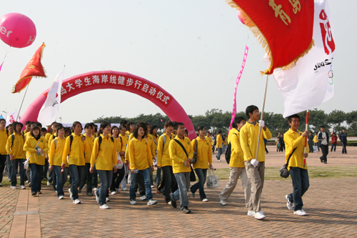 10月21日上午,党的十七大胜利闭幕的日子里,在我校土木学院学生会的号召和组织下,来自我校与青岛大学、中国海洋大学、青岛科技大学的近200名大学生志愿者从八大峡广场出发,拉开了青岛市青春奥运行动——岛城大学生海岸线健步行活动的序幕。