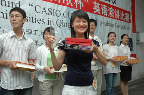 5月27日下午,第三届驻青高校“卡西欧”杯英语演讲比赛在我校成功举办。我校选手李方斐荣获一等奖,山东科技大学的张丹、中国海洋大学的王艺洁分获二等奖;中国海洋大学的张理宁、青岛农业大学的田惠君、青岛科技大学的戴盛获三等奖。其中,戴盛、田惠君分获“最具潜力奖”、“最佳风采奖”。