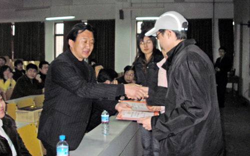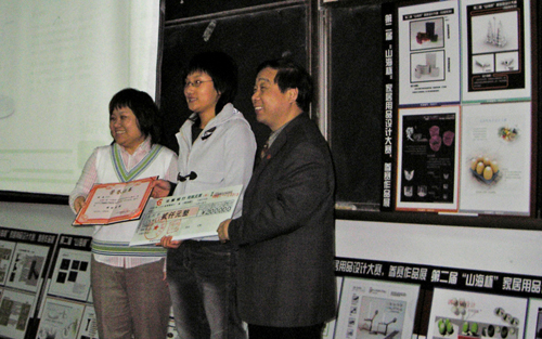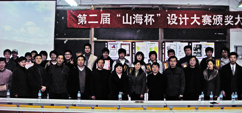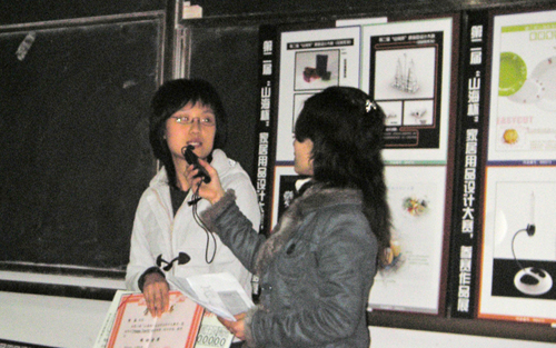 山海集团人力资源部经理首先就此次大赛的概况向与会嘉宾作了简要说明,并对我校学生作品给予极高评价。据介绍,大赛为期四个多月,参与学生120余人,作品81幅,无论是参赛人数还是作品质量都大大高于往届。经过认真严格的评选过程,有22名同学入围最终的奖项角逐。大赛共设最佳选材搭配奖、奇思妙想奖各一名,金、银、铜奖各一名。艺术学院工业设计03级2班谭磊获得本次大赛唯一设计金奖,由杨向荣副书记和山海集团尚女士向其颁发获奖证书及奖金2000元。