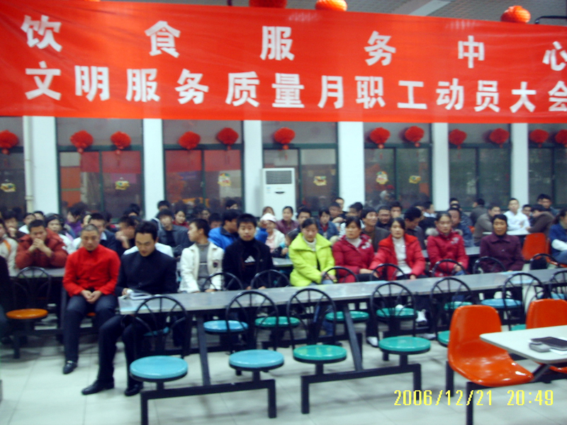 饮食服务中心在活动举办的前夜召开了“文明服务质量月”全体职工动员会,明确提出了“讲文明 树新风 共建和谐校园”的活动口号。要求全体职工要找出自己工作中存在的不足并加以改进、提出自己的工作努力方向,争取在日常服务中零失误、零投诉,使整个中心形成一种人人争做先进文明、积极向上的工作氛围。