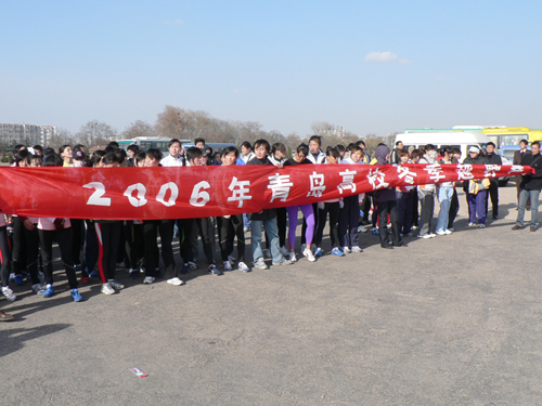 2006年青岛市高校越野赛于12月15日在沧口机场举行,我校22名运动员在教练员董凤翠和纪新涛等老师的带领下,克服路途奔波和天气严寒等不利因素的影响,发扬拼搏精神,获得了男子甲组团体第二名和女子甲组团体第三名的好成绩。另外,王须同同学还获得男子个人第四名,吴美美同学获得女子个人第八名的较好成绩,为学校争得了荣誉。(体育部)