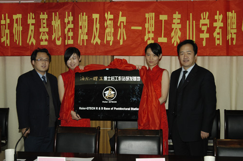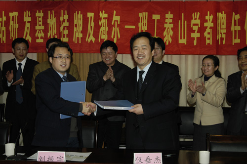 校长仪垂杰和海尔集团博士后科研工作站站长、海尔集团技术研发中心部长刘振宇在双方合作协议书上签字并为海尔—理工博士后工作站研发基地揭牌。青岛海尔医用低温科技有限公司总经理刘占杰博士从仪垂杰校长手中接过沉甸甸的海尔—理工泰山学者聘书。刘占杰博士是我国空调制冷领域有突出贡献的青年专家,2005年被聘为海尔集团的“泰山学者”。