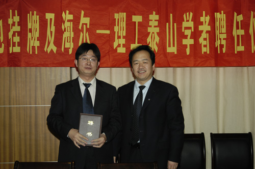 校长仪垂杰为刘占杰博士颁发海尔—理工“泰山学者”聘书