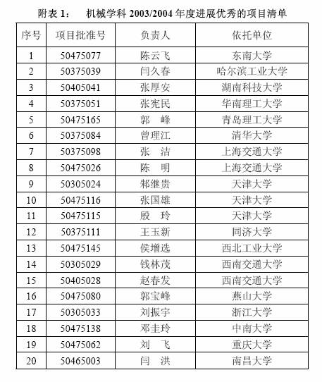 《通报》中指出,截止2006 年2 月28 日16:00,机械学科共审核2003 年、2004 年度各类项目进展报告431 份。大多数项目进展报告做的认真规范、提供的数据资料详实、进展情况良好,其中优秀项目20 项,他们在国内外重要刊物上发表论文,在理论、方法和技术研究方面有明显创新,申请或获取了发明专利,培养高素质科技人才,现予公布表扬。(杨延生)