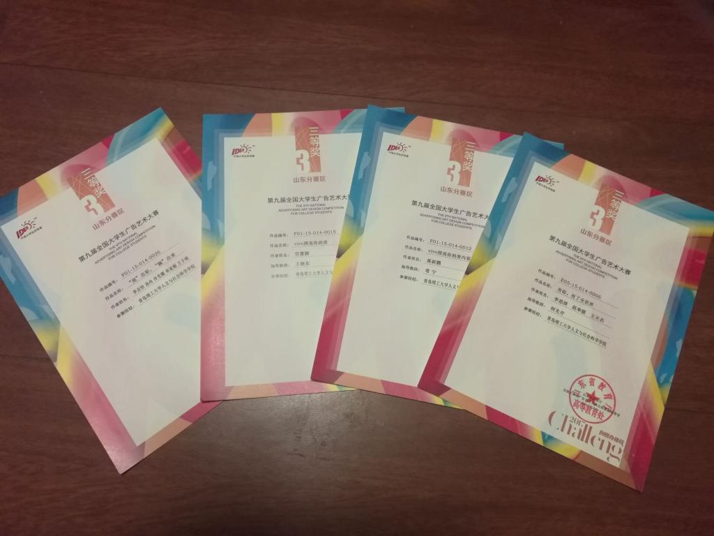 今年我校广告学专业捷报频传,在校竞赛基地的支持下,通过师生共同努力,荣获第九届大广赛全国三等奖1项、省级二等奖1项、省级三等奖4项、省级优秀奖7项,创参赛以来最好成绩。