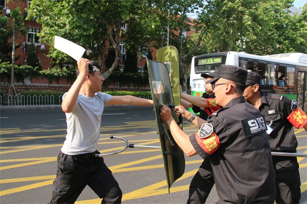 为进一步加强师生应对突发暴恐事件的防范意识,提高面对暴恐事件的合理处理、自护自救及有效逃生避险的能力,最大限度的减少因暴恐事件对师生造成的伤害,确保学校正常教学秩序和师生员工人身安全,努力实现“平安校园”的工作目标,6月6日下午,学校保卫处组织在市北校区科技广场举行反恐防暴演练活动。校党委副书记张殿恒出席并讲话,学生工作处、团委、宣传部、后勤处等相关部门负责人参加活动。