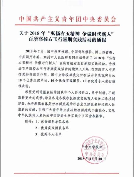 近日,由团中央学校部、中国青年报社主办的2018年“弘扬右玉精神·争做时代新人”百所高校右玉行暑期社会实践专项行动评选结束,我校右玉生态文化旅游开发建设规划团队蒋仕学同学荣获优秀个人。