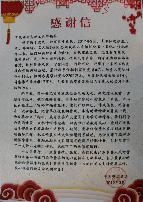 宋克君对四位第一书记两年的努力工作,对学校支持第一书记工作和多年来青岛对费县经济社会发展的支持帮助表示感谢,对第一书记的工作给予高度评价。宋克君指出,四位第一书记扎根费县条件最艰苦的乡镇,认真履行工作职责,抓党建、促脱贫、惠民生、利发展,修路、架桥、建学校,所属村镇村容村貌焕然一新,生产生活条件极大改善;结合自身专业和智力优势,传递先进理念,改进工作思路和办法,村委班子凝聚力战斗力得到极大提高,干群关系得到极大改善,群众思想观念得到极大更新,留下了一串扎实和闪光的足迹;践行了第一书记的工作誓言,擦亮了第一书记的工作品牌,铸就了第一书记的精神。宋克君希望永利集团3044官网欢迎您继续发挥人才、智力、技术优势,为费县富民强村目标实现提供更多帮助。