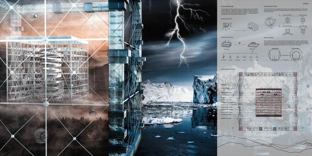 在此次大赛中,作品《Memory Cube Skyscraper》别出心裁,立足于历史与未来发展,将传统的摩天大楼重新定义为历史场景的记录器和叙述者,并赋予其能够收集物理场景的物理参数的功能,对未来人类的真实生活场景进行模拟。独特的功能性设计使该建筑成为数据存储中心和场景模拟器,代替了以往通过化石,不完整的历史文件来了解过去世界的方法,让气候或板块运动等不可控因素形成的景观奇景得以延续。设计整体构思完善,特色鲜明。大赛组委会也对该设计的独特性,功能性给予了高度肯定,展现了建筑与城乡规划学院学子不俗的专业实力。