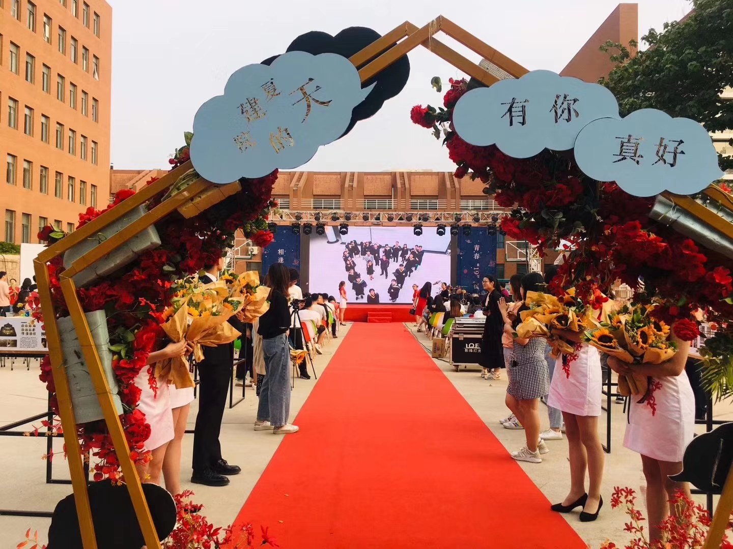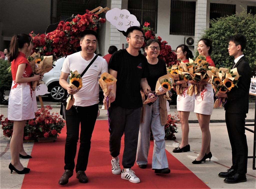 学院在入口处为毕业生们准备了毕业花门和红毯,并为每位毕业生送上手捧花“向日葵”,希望他们带着学院的祝福,走一席红毯,伴一路繁花,从此披荆斩棘,都有锦绣前程。下午五时许,各导师组老师、毕业生们以及部分家长开始陆续到达晚会现场。有的同学与家长牵手走过红毯,感恩父母养育不易;有的同学与老师一起走过红毯,感谢恩师诲人不倦;更有三两好友一起走过,感谢生活让大家相遇、相知,共同成长。