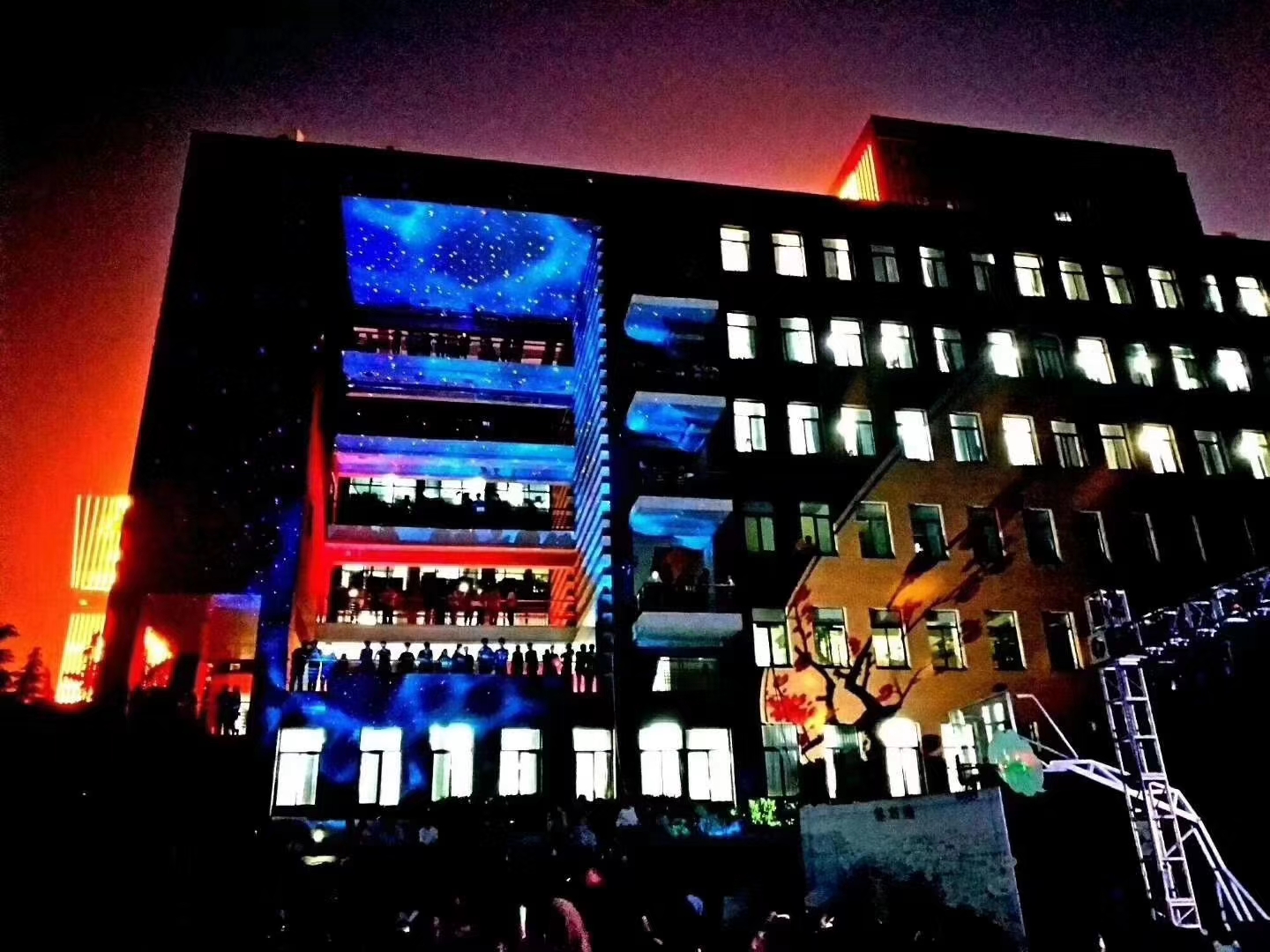 6月21日,时值夏至,流光溢彩的灯光秀吸引了众多同学和老师的目光。此次灯光秀是由学院于红霞副教授指导的建筑物理环境协会助阵演出。浪漫、炫酷的灯光秀,是以多台激光投影灯为画笔,以建筑馆外立面为画布,通过投影图案叠加,“绘”出了一幕幕精彩画面,其中,若星空般梦幻的星际空间、如泉水般轻柔荡漾的层叠波纹等效果,引人入胜,将毕业晚会现场气氛推到了高潮。