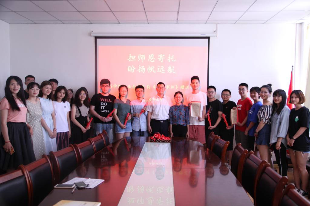 匆匆离别季,深深师生情。6月23日上午10点,商学院于一教403举办“担师恩寄托,盼扬帆远航”《朱子家训》赠送仪式,2015级毕业生辅导员刘心芝历时一年誊写100份《朱子家训》赠予即将离校的毕业生,党总支副书记董兰国参加赠送仪式。