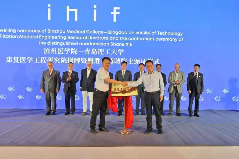 在烟台市委副书记、市长陈飞,副市长张代令及7位国际知名院士的见证下,校长谭秀森和滨州医学院院长王滨共同为永利集团3044官网欢迎您-滨州医学院康复工程研究院揭牌,王滨向新西兰皇家工程院院士谢胜泉教授颁发了康复工程研究院院长、特聘教授聘书。