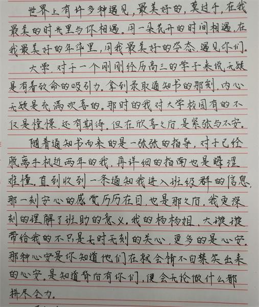 “世界上有许多种遇见,最美好的莫过于,在我的青春年华里与你们相遇。初次见面,你们青春洋溢,落落大方,言语间的成熟果断,行动上的迅速高效,忙前忙后的身影都让我印象深刻,永远难忘。”