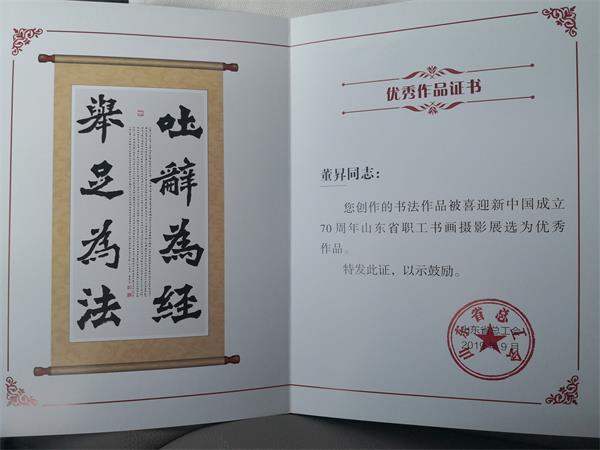 为庆祝新中国成立70周年,学习宣传贯彻习近平新时代中国特色社会主义思想,积极营造庆祝新中国成立70周年浓厚氛围,培育和弘扬社会主义核心价值观,我校工会积极组织教职工参加山东省、青岛市组织的教职工系列活动,在山东省总工会举办“喜迎新中国成立70周年”全省职工书画展评选活动中,我校陈伟、董昇老师的书法作品被评选为山东省总工会书画展优秀作品,陈伟老师的四尺行草《书论一则》作品获省总工会书画展入展书法作品。董昇老师的另外两幅幅书法作品分别荣获山东省科技界“习近平用典”书画作品一等奖和美术出版杯“山东省第三届教师书法大赛”三等奖。
