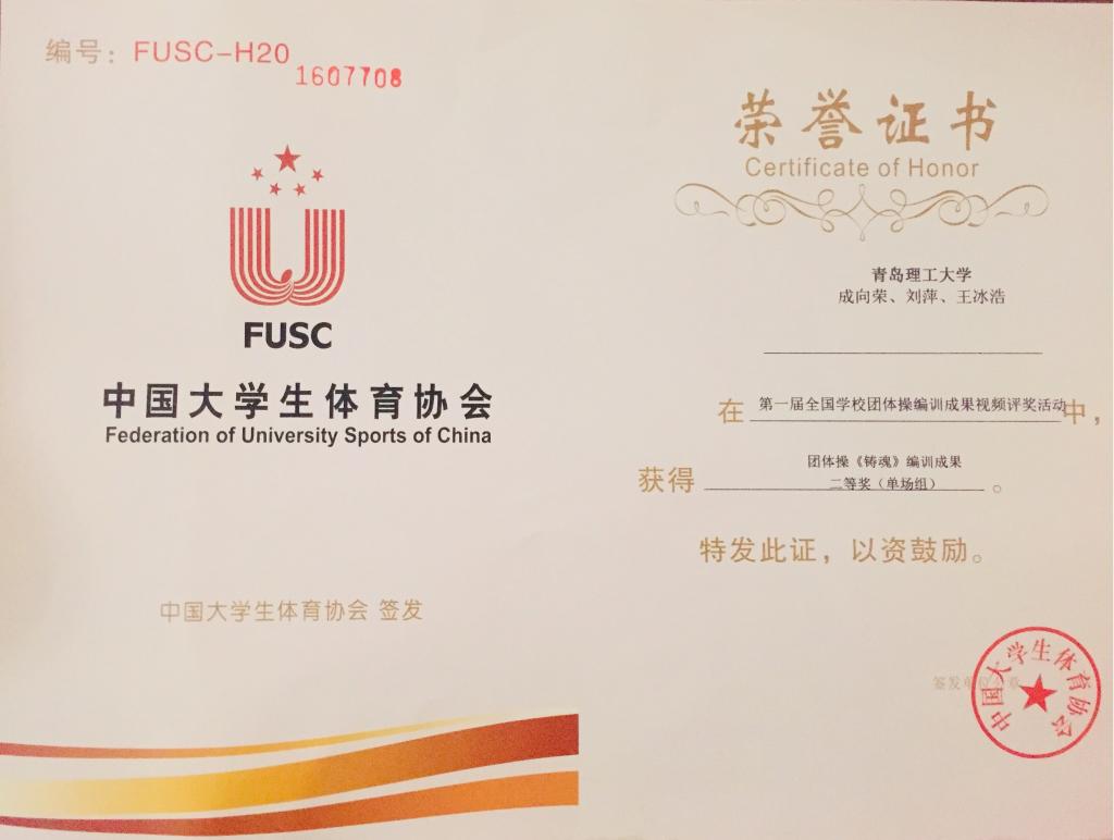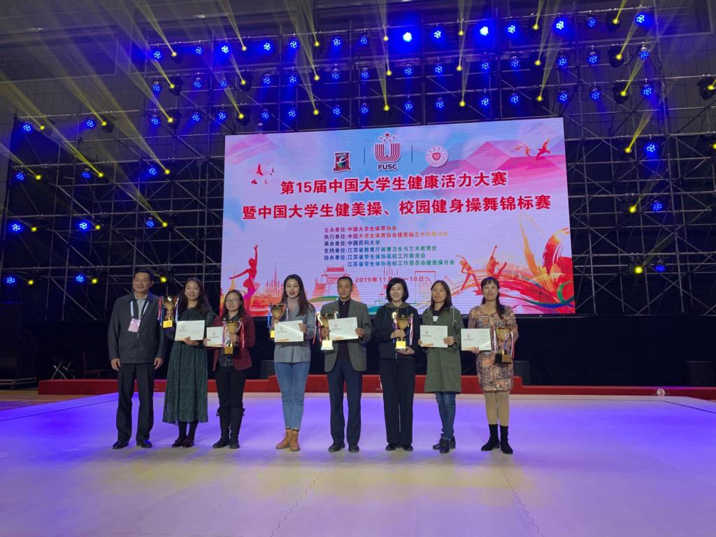 在江苏南京进行的第15届中国大学生健康活力大赛暨中国大学生健美操、健身操舞锦标赛上,对第一届全国学校团体操编训成果视频评奖活动进行颁奖,我校选送的作品团体操《铸魂》获得编训成果单场组二等奖。