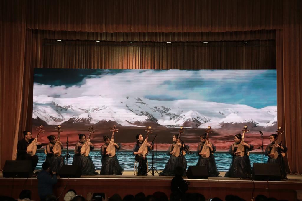 此次音乐会传统文化气息浓郁、底蕴深厚。二胡、笙、阮族、琵琶、笛子……富含中华独有文化基因的民族乐器依次亮相,风格或简约含蓄、或饱满悠扬,演奏出民族音乐的华美乐章。音乐会在民乐重奏《敦煌新语》中拉开帷幕,笙重奏《阿细欢歌》活泼跳荡,阮族重奏《风起·絮飞扬》缠绵悠扬,笛子二重奏《采莲》轻盈欢快,弦乐重奏《打虎上山》气势磅礴、节奏鲜明,琵琶重奏《送我一枝玫瑰花》则极富民族特色,展示了新疆独具特色的音乐风采。演出在器乐合奏《美丽的凤尾竹》《电影音乐联奏》《我的祖国》中落下帷幕,其中《电影音乐联奏》之“洪湖水浪打浪”由我校青年教师张珊珊老师担任独唱。整场音乐会为观众呈现出恢弘的民族音乐画卷,令人回味无穷。