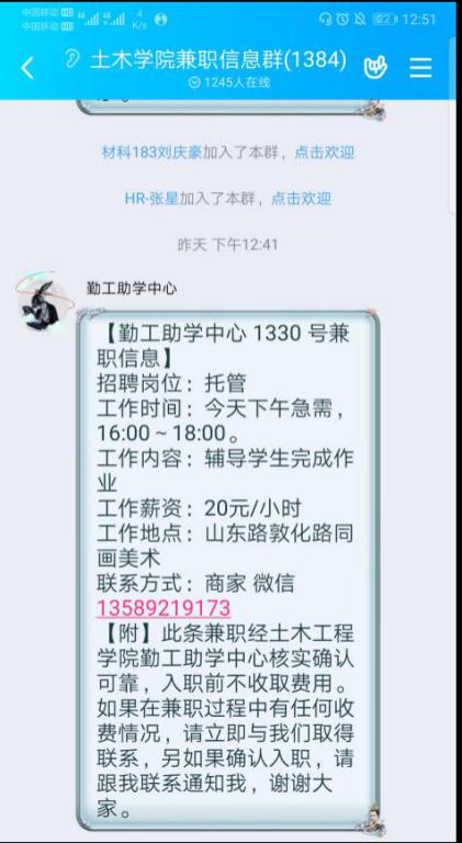 针对于在校大学生兼职人数较多,在校大学生兼职受骗屡见不鲜。学院专门设立勤工助学中心,提前帮助同学审查兼职单位资历,对每一条兼职信息进行严格的把关,确保每一条兼职信息的安全性,为同学提供更好的兼职项目。并开设“土木工程学院兼职信息群”,现兼职群内成员1380余人,已累计发布信息1400余条。有效的维护好了大学生在校期间的合法权益,提供了良好的平台。