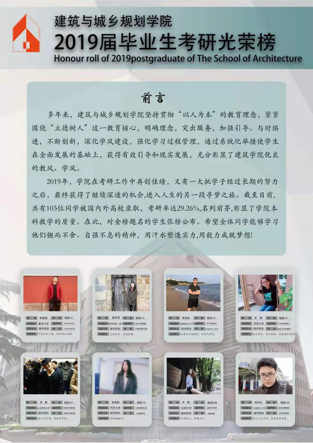 二是学院学风扎实,学生素质长足提高。2019年,学院有107人分别被伦敦大学学院、加利福尼亚大学洛杉矶分校、同济大学、东南大学、天津大学等国内外高校录取,考研率达31.36%。其中,城乡规划学、建筑学、风景园林学专业考研率突破30%,有5个班级考研率突破30%,有13个宿舍考研率突破50%。2019年,学院共有28项国家级大学生创新创业训练计划项目得到省级立项,共有20余项学生科技创新项目和7项科技创新活动被学校批准立项。学院同学在省部级以上各类竞赛中获奖92项,其中,以Evolo国际摩天大楼建筑设计竞赛一等奖为代表的国际级奖项27项,参与设计竞赛的学生达到400余人,打造了稳定高效的学院优秀专业学科竞赛师生团队。