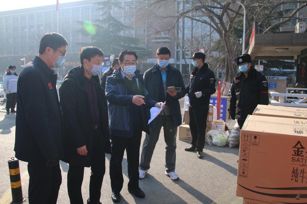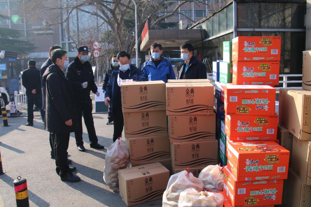 为贯彻落实学校党委关于防控工作的总体部署,更好地发挥工会组织在疫情防控工作中的作用,2月10日上午,党委副书记杨兴昌、工会主席周忠学代表学校向防控办、保卫处、黄岛校区指挥部等防控一线送去了生活物资。