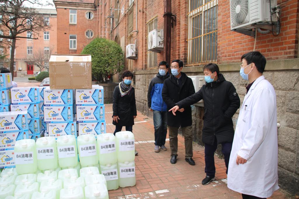 2月6日上午,青岛校友会就将首批防控物资----20件防护服和5500瓶84消毒液送到学校校医院;