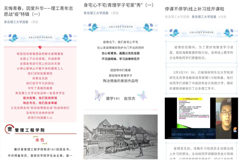 发挥作用,彰显青年担当。疫情当前,使命在肩。一批批优秀的返乡理工青年,积极响应上级团组织的号召,在做好自身防护的前提下,为当地疫情防控工作贡献青春力量,用实际行动彰显理工青年的责任与担当。各分团委结合专业特色和学院实际,开展形式多样的集思想性、教育性、知识性、生活性于一体的活动,带领坚守在家的团员青年们积极抗“疫”。学生们纷纷拿起手中的笔纸、架起手机与相机,用生动的图画、深情的文字、悠扬的歌声、有力的舞姿,用自己的实际行动,传达最真挚的祝福,唱响最嘹亮的赞歌,用别样的方式,凝心聚力,共渡难关。此外,校团委积极引导广大青年团员充分利用居家时间不断充实自我,制定学习计划,保持健康作息时间,“停课不停学”,为疫情防控做出自己独特的贡献。