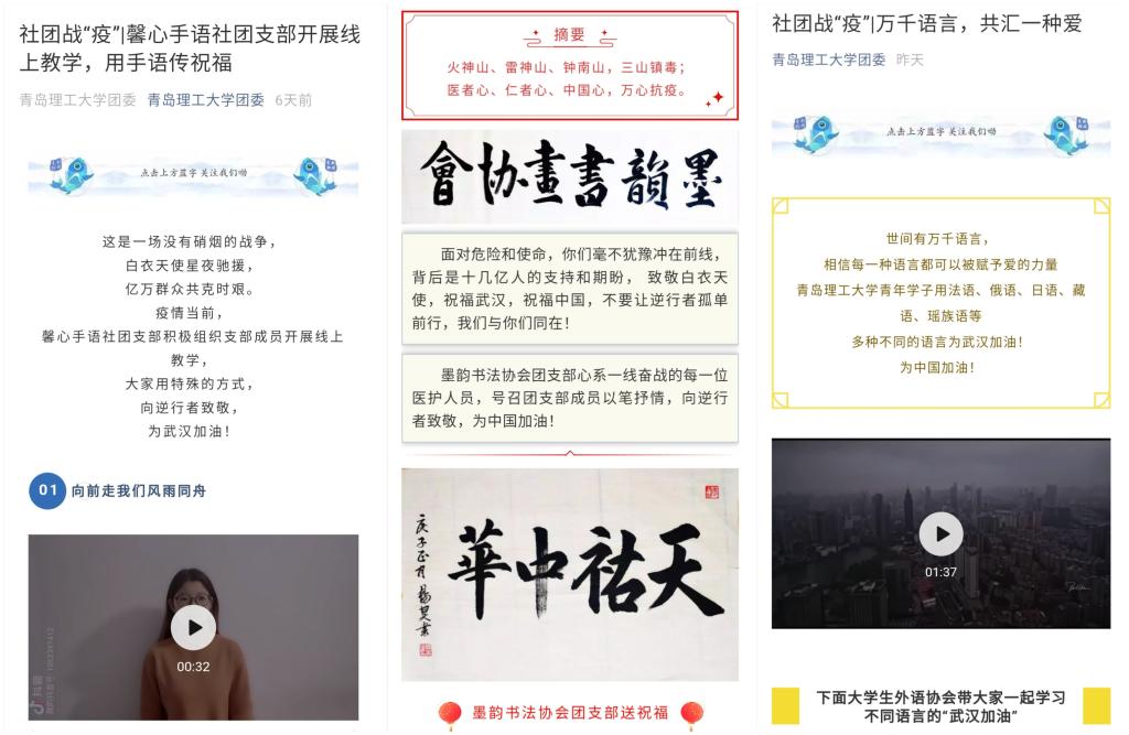 第二课堂,发挥育人功效。利用第二课堂资源优势,将美育劳育实践教育融入到防控疫情阻击战中,力求多阵地传播,多层次发动,全员动员,全员覆盖。校团委充分激发学生社团团支部活力,发挥社团团支部育人功能。墨韵书法协会以墨抒情,用书法为武汉加油;文明礼仪宣讲团录制防疫科普视频,引导同学科学防疫;馨心手语社开展线上手语教学,用手语传递祝福;国旗护卫队、大学生艺术团创造网络文化作品,弘扬青春正能量;论剑读书会发起共享好书读书活动,引导学生向经典学习;各体育类社团开展线上健康运动打卡,带领同学加入健康运动的行列中……各具特色的社团活动带动和丰富了广大同学的第二课堂,使理工青年足不出户拓展知识面、开启新技能。