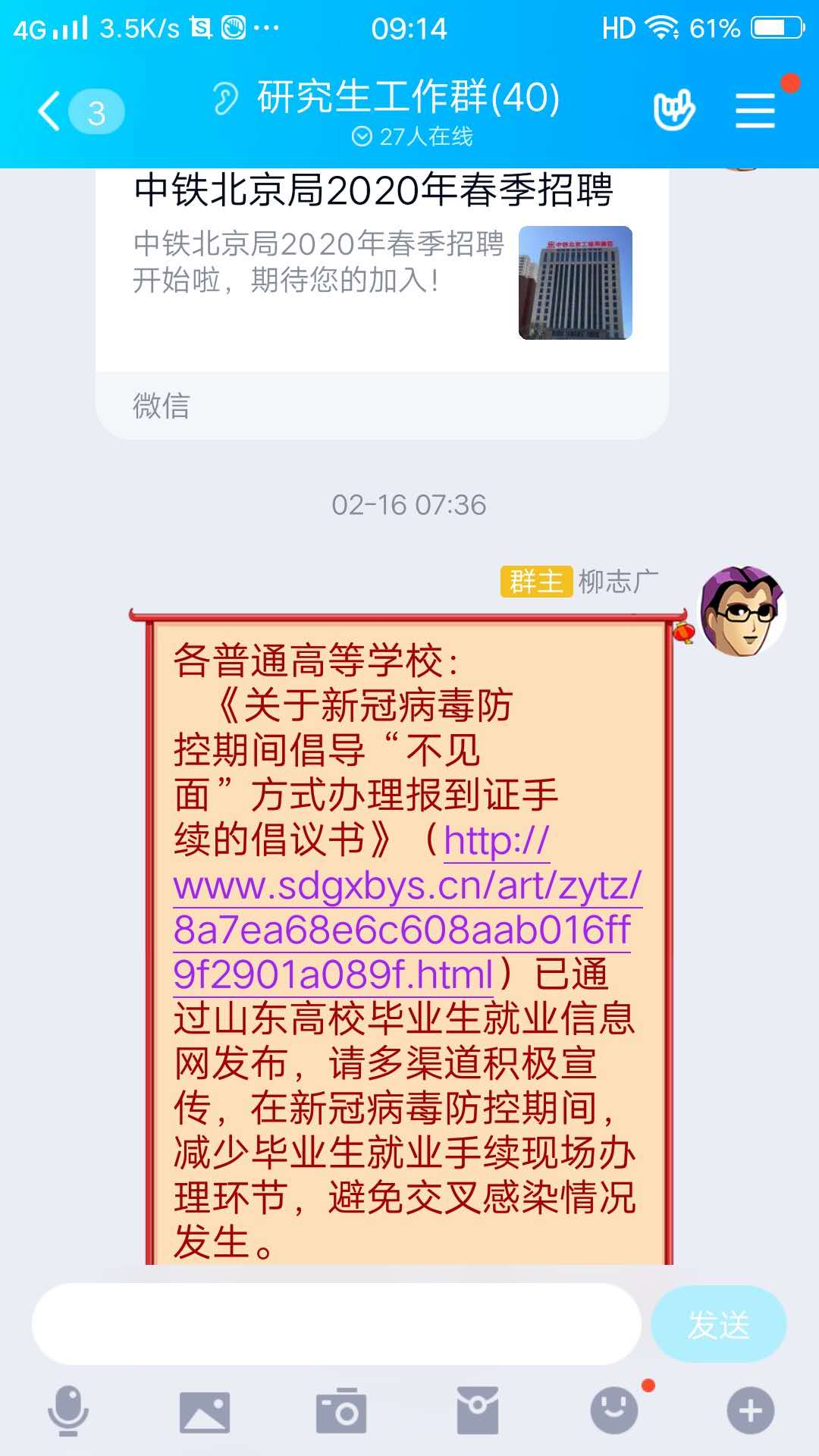 充分发挥研究生工作部(研究生处)、大学生就业指导中心与各学院联动机制,积极回应学生关切,做信息通知的“及时雨”。2020年国家公务员考 试面试推迟公告发出后,第一时间通知并提醒毕业生密切关注招录机关后续通知;将教育部“24365”服务和教育部遴选推荐的社会招聘网站(前程无忧、智联招聘、BOSS直聘、中华英才网、猎聘网)的校园招聘专区信息向毕业生推送;将“就选山东”-山东省高校毕业生求职招聘云平台向毕业生推送,有效避免毕业生接收信息不对称。