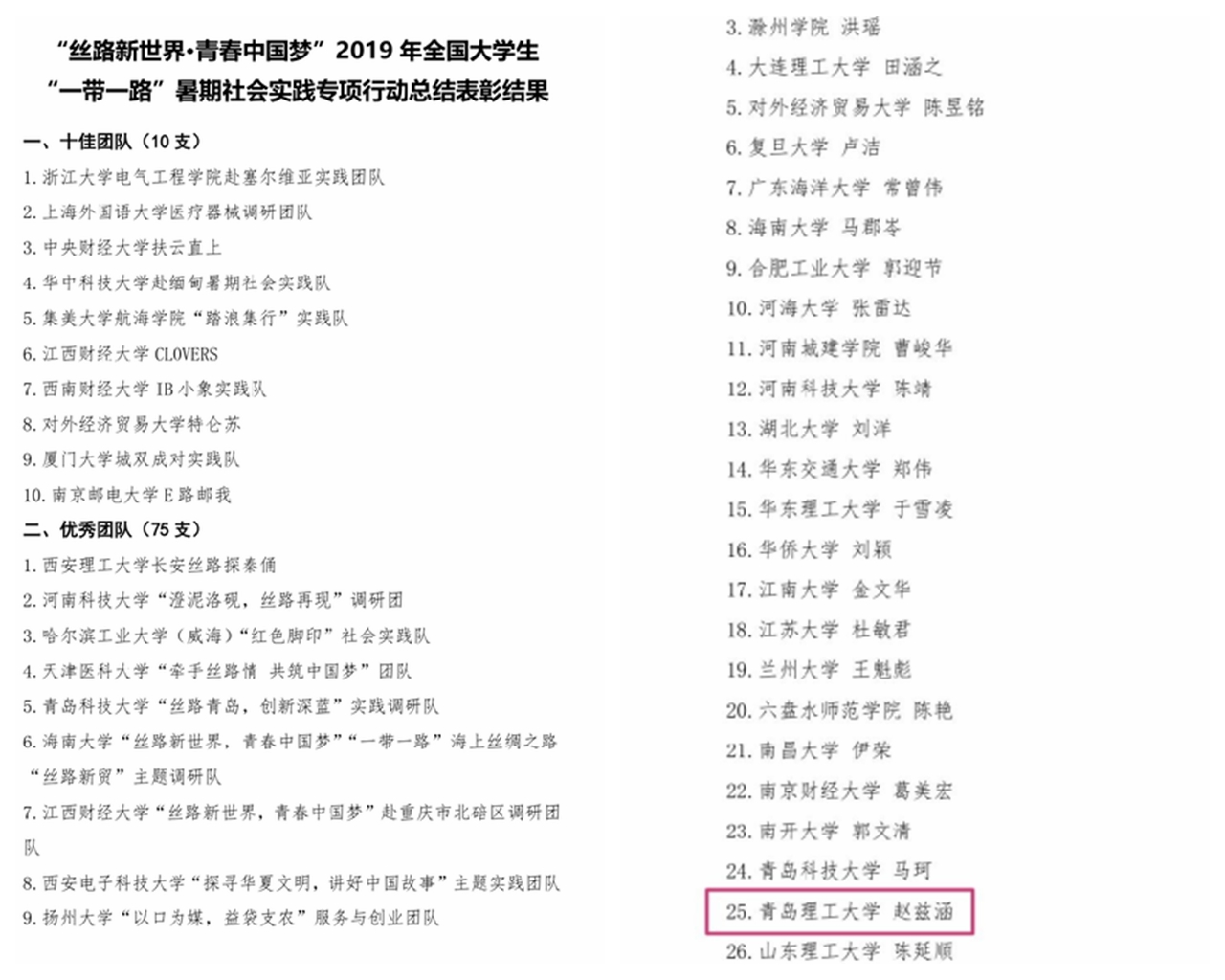 近日,由共青团中央青年发展部指导,中国大学生“一带-路”协同发展行动中心主办的“丝路新世界·青春中国梦”2019年全国大学生 “一带一路”暑期社会实践专项行动成果遴选名单公示,我校星辰大海实践团队赵兹涵同学荣获优秀个人荣誉称号。