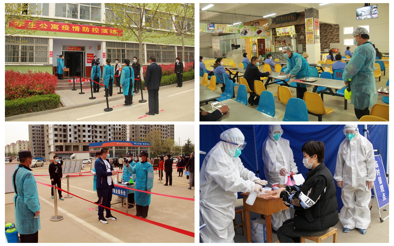 演练以《山东省高等学校2020年春季学期开学工作指南》、《山东省高等学校2020年春季学期开学条件核验细则》为指导,共设五个场景,分别模拟在校区南门入口、4号教学楼、东苑学生餐厅、6号学生公寓和运动场等人员密集场所突发师生体温异常情况应急处置,演练覆盖了师生出入管理、体温检测、秩序维持、临时留观转诊点接诊、复测体温、上报流程、确诊人员转送等环节。校区疫情防控领导小组成员作为评委对演练流程进行了打分,对存在的问题进行了现场反馈。