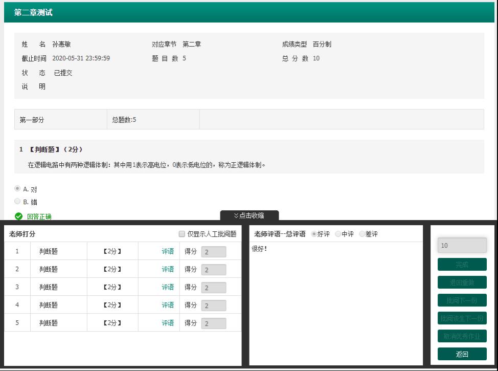 课后反馈环节对于线上教学来说显得十分重要,既是直播课堂的延伸和补充,也是教师了解和掌握学生学习情况,进一步改进自己教学过程的依据。在智慧树翻转课堂布置课后作业,要求学生在期限内以拍照或电子文档的形式提交。通过对学生作业的批阅,并利用平台上的数据分析,可及时了解学生对课程的掌握情况和监测学生任务完成情况,为后续的教学提供参考。对作业出错的环节,及时将错误的原因和解题思路反馈给学生们,使学生对此知识点的认识会更为深刻。作业的标准答案会在QQ课程群以拍照的形式在作业批阅结束后发送,让学生掌握作业中每一道题目的标准解题步骤。同时,学生也能在智慧树平台上看到作业的评语,知道自己本次作业的完成情况。