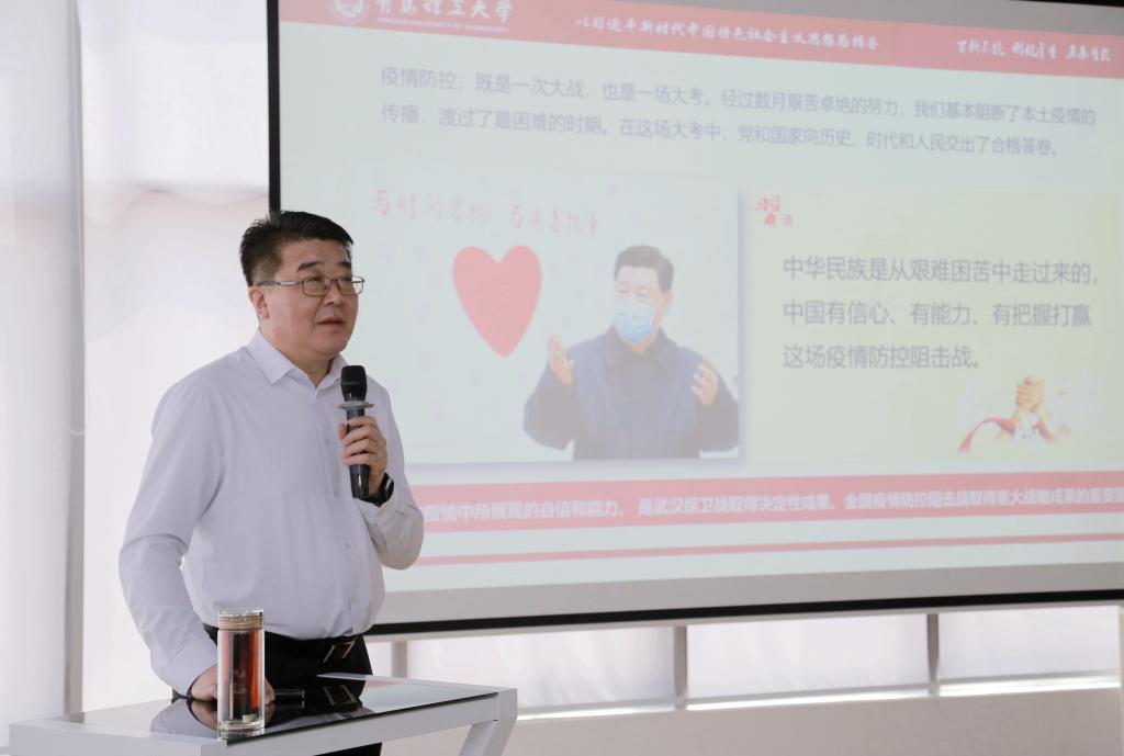 讲座之后,各学院分别以“敬畏生命、爱国励志”为主题,通过邀请校外专家讲座、战疫典型人物报告、思政课教师宣讲、主题班会、“理工阳光”心理讲座等丰富多彩的形式,在学院、年级、班级各层面上好第一堂“思政课”“健康课”“教管课”,扎实做好爱国主义教育、健康安全教育、规矩纪律教育、感恩教育、劳动教育;各学院领导班子、辅导员、班主任纷纷深入学生、深入宿舍,第一时间了解返校学生思想动态,跟进开展防疫知识和思想教育,帮助学生解决实际困难,厚植爱国主义情怀,坚定学生防疫信心。