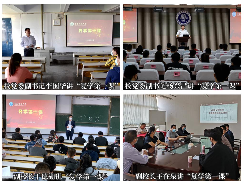 讲好战疫故事,弘扬时代精神。为深入贯彻落实习近平总书记关于统筹推进疫情防控和经济发展系列重要讲话精神,落实省教育厅关于上好复学第一课相关要求,切实做好学校疫情防控和返校开学工作,5月27日上午,校党委书记王亚军、校长谭秀森等领导班子成员、思政课教师,带头深入联系学院、走上思政课堂,以围坐交流、讲座分享、问答沟通等多种形式,“组团”同步开讲“复学第一课”,为首批返校研究生、毕业年级学生送上内容丰富、内涵深刻的“思想盛宴”。