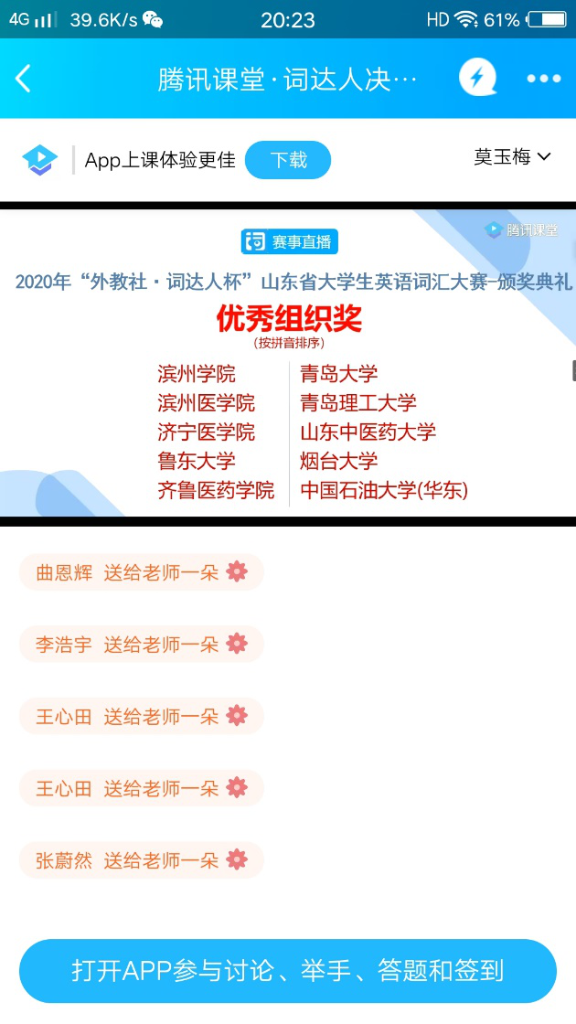 “外教社•词达人杯”大学生英语词汇大赛是上海外语教育出版社为更好地满足高校大学英语线上教学需求,联合山东省本科教育大学外语教学指导委员会联合主办的公益性在线词汇竞赛活动。比赛依托外教社“词达人英语词汇智慧学习平台”微信公众号,面向省内高校非英语专业学生,以大学英语四、六级考试词汇为竞赛内容,通过在线测试方式完成竞赛。自4月启动以来,“词达人”词汇大赛吸引了全省本科、独立学院和高职在内的65所高校共16万多名学生报名参加,参赛院校数量和人数规模均远超同类竞赛。本校学生对本次比赛也表现出了极大的热情,初赛报名人数达到了6453人。经过精心地前期策划和安排,在“词达人”平台的协助下,我校分别于5月8日和5月16日成功地举行了校内初赛和复赛的选拔工作,最终选出成绩前20名同学参加山东省决赛。