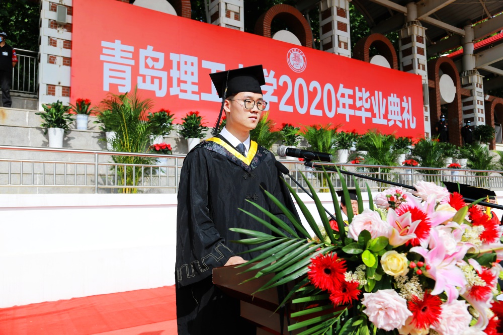 管理工程学院贾儒彬同学代表毕业生发言,表示无论走到哪里,身在何方,都将秉承“严谨、勤奋、求实、创新”的校训和“百折不挠、刚毅厚重、勇承重载”的理工精神,做母校靓丽的名片,以青春之名,在社会发展、民族复兴、母校繁荣的宏伟征程中书写属于理工青年的青春华章!