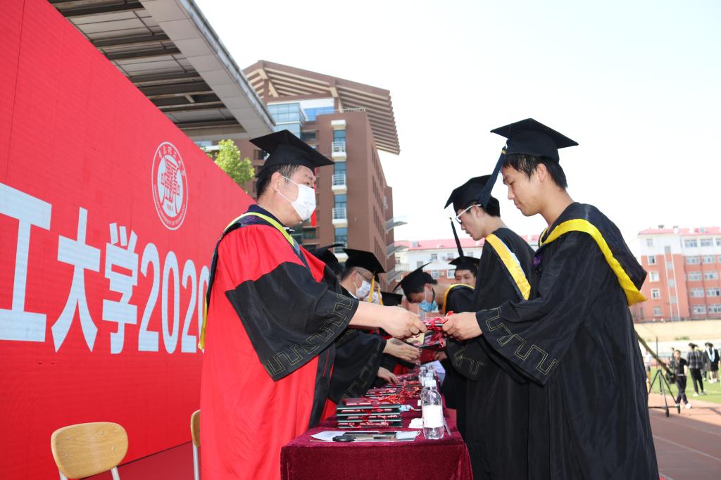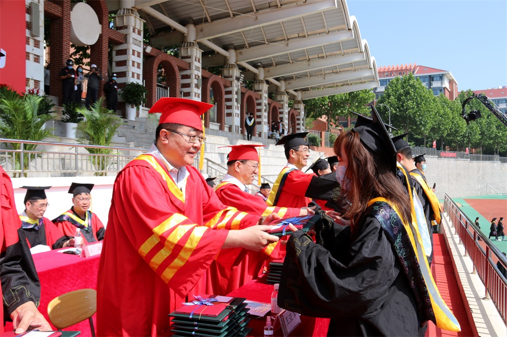 典礼上,谭秀森发表讲话,王在泉宣读了《关于授予2020届毕业生学位的决定》和《关于表彰2020届优秀毕业生的决定》,师生代表分别发言。校领导分校区为现场参加毕业典礼的每一位毕业生颁发了学历、学位证书并合影留念。